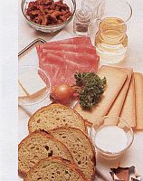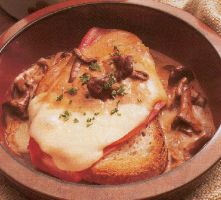 ตักน้ำซอสเห็ดที่ทำไว้บนขนมปังหมูแฮม และเนยแข็ง