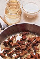 2. รินเหล้าไวน์ขาวใส่ลงไปในเห็ดที่ผัดแล้วปล่อยทิ้งไว้
