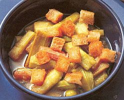 วิธีปรุง Rhabarber ต้มกับน้ำตาลและ การใช้ Brotwuerfeli ขนมปังชิ้นสีเหลี่ยมทอดโรยหน้า