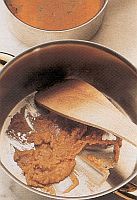ใส่ลงไปในหม้อใหญ่ ตักแป้งสาลีใส่ลงไปคนให้เข้ากันตามรูปที่เห็น