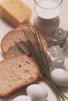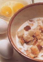 หักขนมปังเป็นชิ้นๆใส่ในน้ำนมสดทิ้งไว้ชั่วครู่ นำไข่ไก่ เนยแข็งขูด