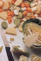 นำผักทั้งหมดมาล้างให้สะอาดและหั่นเป็นชิ้นสีเหลี่ยมเล็กตามรูป