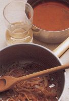 มาใส่กระทะทำให้ละลานและใส่หอมที่หั่นเป็นเส้นยาวตามขวางลงไปผัดไปมา