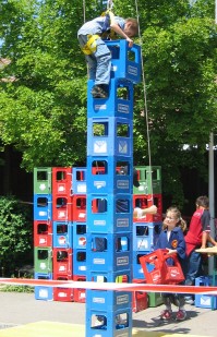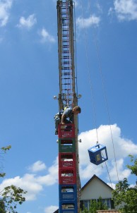 น้องคนนี้กำลังทำสมาธิกับการโรยตัวต่อถัง สนับสนุนเกมส์โดยตำรวจดับเพลิง ใช้รถกระเช้าใหญ่ๆ โรยเชือกไว้