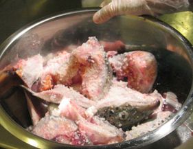 ออกเป็นชิ้นใหญ่ๆ แล้วซาวเกลือ (ล้างเมือก และ กลิ่นคาว )