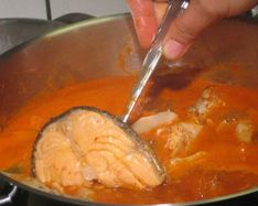 เราสังเกตุดูว่าน้ำแกงเริ่ม (จะ) เดือด ก็หยิบปลาใส่ลงไป ให้หมด