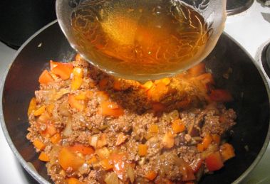 ผัดคลุกเคล้าให้เครื่องปรุงต่างๆเข้ากันดีเสียก่อนจะใส่น้ำซุบ