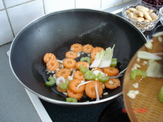 ตั้งกระทะให้ร้อนปานกลางใส่น้ำมัน กระเทียมผัดให้หอม ใส่แครอท ก้านเชอรี่ บล๊อครี่ ผักกาดขาว