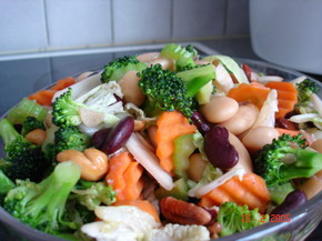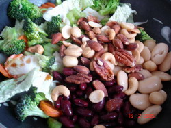 เมื่อใส่ผัก ( ไม่ต้องให้นานสำหรับคนชอบผักกรอบๆ )ซ๊อตปรุงรสทั้งหมดแล้ว ใส่ถั่วรวมลงคลุกกลับไปมา ปิดไฟตักใส่จานเสริฟ