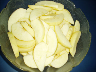 หลังจากนั้นเอาแอ๊บเปิ้ลที่เราล้างและหั่นไว้มาเรียงลงในถาดให้เต็มแบบนี้ค่ะ
