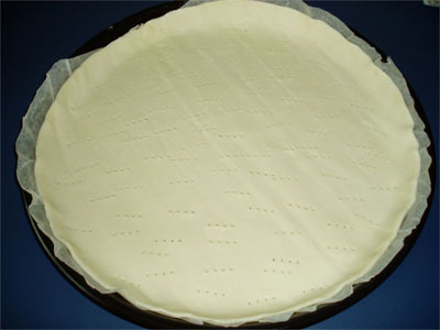 เสร็จแล้วเอาแผ่นพายมาวางลงในถาดใช้มือบีบๆให้เข้ากะถาดหรือกดๆให้ลงพอดีกะก้นถาดนะค่ะ