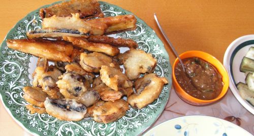 แล้วนำเห็ดและมะเขือยาวมาชุบแป้งทอดให้เหลืองกรอบ
