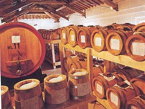 ถังไม้ที่ใหญ่กว่าที่บรรจุน้ำส้มสายชูอายุน้อยกว่าจะอยู่ข้างบน