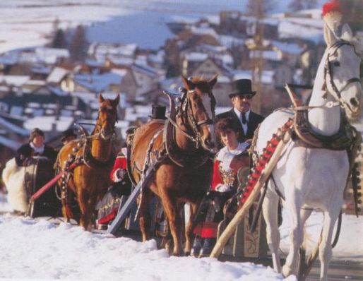 แคร่เลื่อนบนน้ำแข็งลากด้วยม้าของชาวแองกาดีน ประเพณีเก่าแก่ที่ตกทอดมาจากชาวโรมันเก่า สมัยที่เข้ามาอาศัยอยู่ที่นี่และชาวสวิสได้รับตกทอดสืบต่อมา